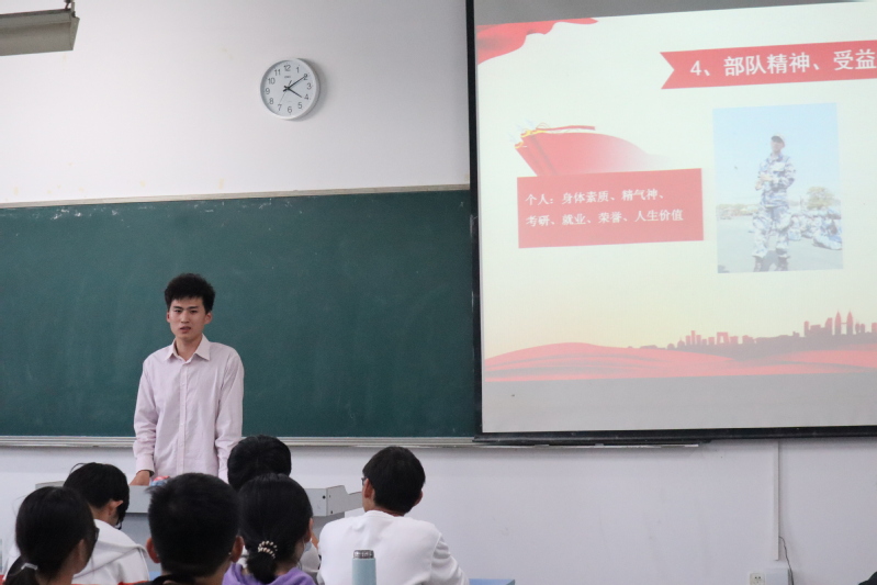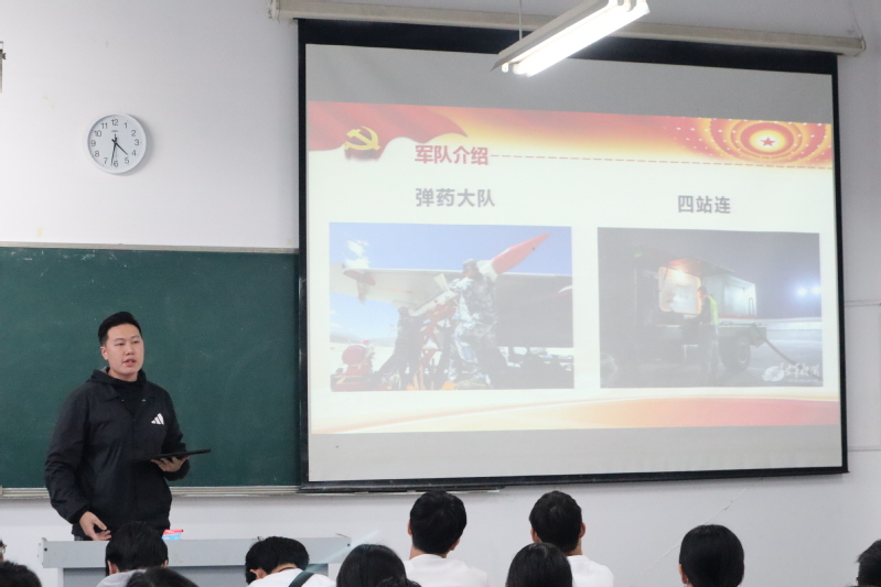 随后,王子祯为同学们讲述了他的军旅生涯。他回顾自己在部队的经历,分享了他在训练中苦累交加但是弥足珍贵的记忆。同时他向同学们介绍了他所在的空军场站,通过铿锵的言语和真实的图片给大家带来了直观的感受。他号召同学们学习军人坚韧的意志,永葆爱国之情和报国之心,积极响应国家号召,积极投身军营,努力在新时代建功立业。