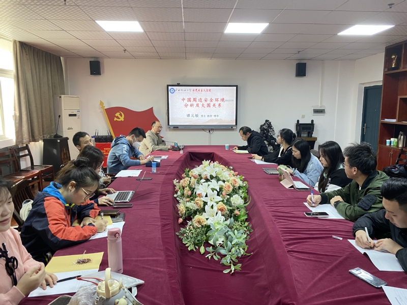 报告会主题为《中国周边安全环境分析及中美关系》。谭元敏教授首先根据地缘政治的主要流派、中美俄陆上海上邻国对比,分析了中国周边安全环境的有利和不利因素。其次,梳理了中美关系发展历程,围绕“投资、结盟、竞争”新三分法分析了中国安全环境的新变化。最后,对中美关系变化发展的原因做了系统深刻的分析。