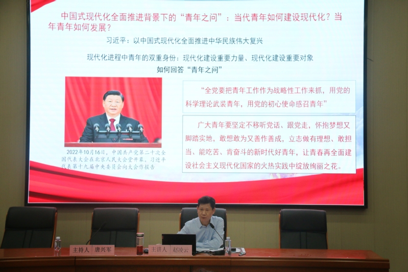 赵凌云教授以现代化进程中青年的双重身份入题,向在座师生发出当代青年如何建设现代化?”“当年青年如何发展?青年之问。随后,他结合党的二十大报告中关于青年的重要论述和自己的学习体会指出,回答青年之问的关键在于用党的创新理论武装自己,并从”“”“”“四个层面展开系统论述。赵教授认为,就是要系统掌握习近平新时代中国特色社会主义思想的知识体系,就是要深刻领会习近平新时代中国特色社会主义思想的形成逻辑,就是要切实践行习近平新时代中国特色社会主义思想的世界观方法论,就是要牢固确立对党的科学理论重大意义和自身使命的精神体认。当代青年要充分认识习近平新时代中国特色社会主义思想的重大意义,中国式现代化进程中清醒认识和努力担当青年使命,把自身发展融入现代化建设,立志做有理想、敢担当、能吃苦、肯奋斗的新时代好青年。