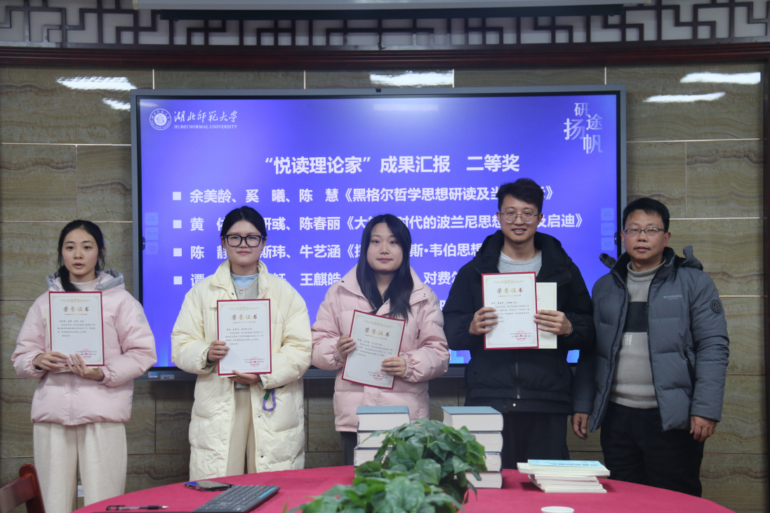 余美龄、奚曦、陈慧组的阅读汇报成果《黑格尔哲学思想研读及当代启示》、黄依、易妍彧、陈春丽组的阅读汇报成果《大转型时代的波兰尼思想理解及启迪》、陈静、王斯玮、牛艺涵组的阅读汇报成果《探索马克斯·韦伯思想及当代启迪》、谭冲、薛晓轩、王麒皓组阅读汇报成果《史学启迪:对费尔南·布罗代尔“长时段”理论的浅析》荣获二等奖,由伟德国际victor1946副院长王振钰老师予以颁奖。