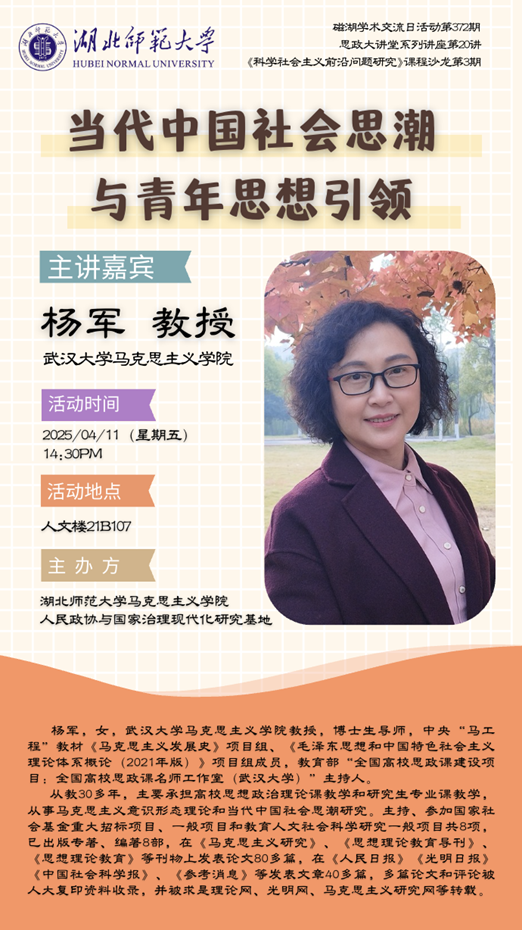 为切实增强当代青年对多元社会思潮的辨识能力,引导青年树立正确的世界观、人生观和价值观,不断提升思政引领力,伟德国际victor1946特举办第20期思政大讲堂系列讲座,邀请武汉大学伟德国际victor1946杨军教授围绕“当代中国社会思潮与青年思想引领”进行深度解析。欢迎广大同学积极参与,共同探索青年思想引领的新路径!